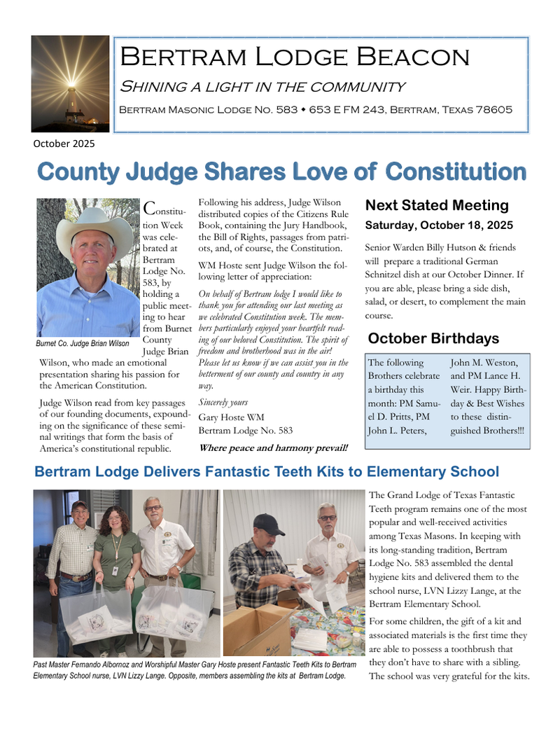 As we continue to strengthen our bonds and build a more connected Masonic community, I’d like to extend an open invitation to all lodges within District #49. If you have any upcoming events—be it meetings, fundraisers, community service projects, or special gatherings—that you'd like to have posted or listed on our district webpage, please don’t hesitate to reach out.